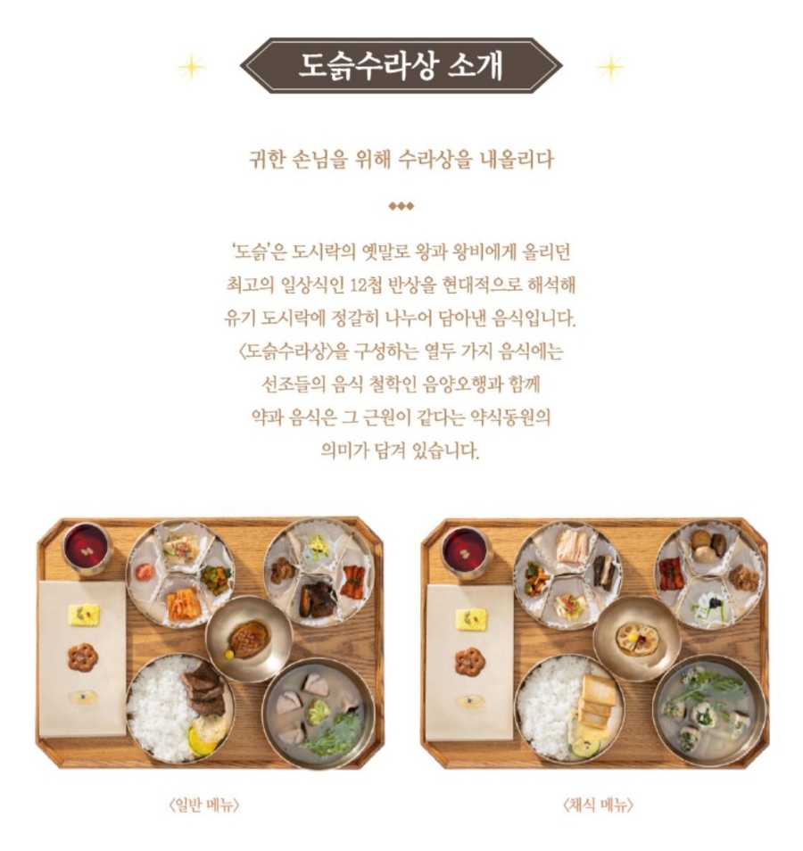 '도슭'은 도시락의 옜말로 왕과 왕비에세 올리던 최고의 일상식인 12첩 반상을 현대적으로 해석해 유기 도시락에 정갈히 나누어 담아낸 음식입니다. 〈도슭수라상〉을 구성하는 열두 가지 음식에는 선조들의 음식 철학인 음양오행과 함께 약과 음식은 그 근원이 같다는 약식동원의 의미가 담겨있습니다.