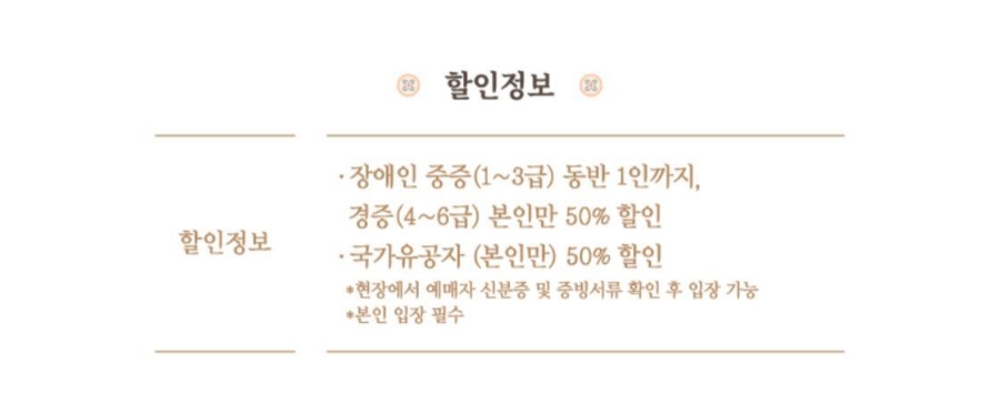 - 장애인 중증(1~3급) 본인 포함 2인 50%할인/ 장애인 경증(4급 이하), 국가유공자 본인 한정 50% 할인